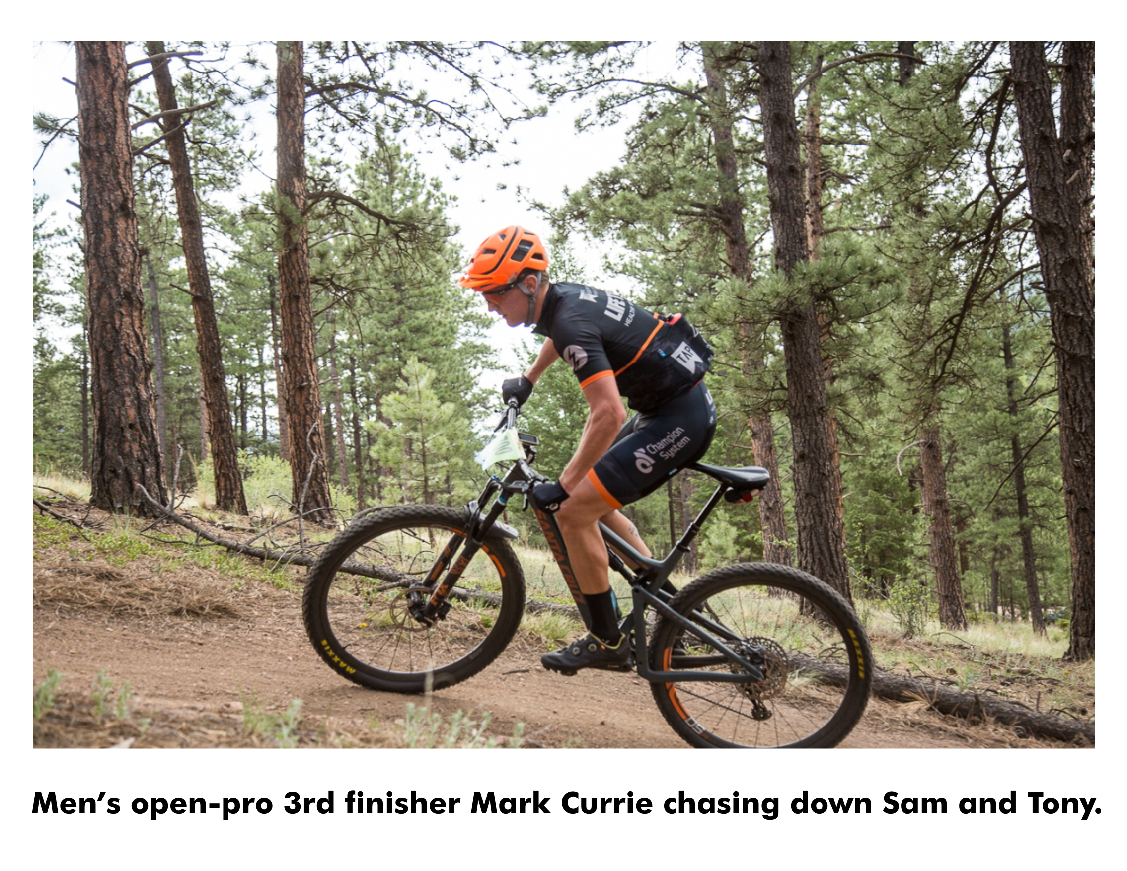 As we descended to the bridge, Sam Furness suddenly ripped past us and crossed the bridge first, letting Mark and I know this would be more than a two-horse race. When we started to climb again after the bridge, I was feeling strong, and knowing that we had a twenty minute single track descent coming up where I would lose chunks of time to Mark and Sam, I decided to put in a big effort. I was able to put a few minutes on them before we hit the Colorado trail, but as predicted, by the time we finished the descent, Mark had reeled me in and Sam was right on my heels.