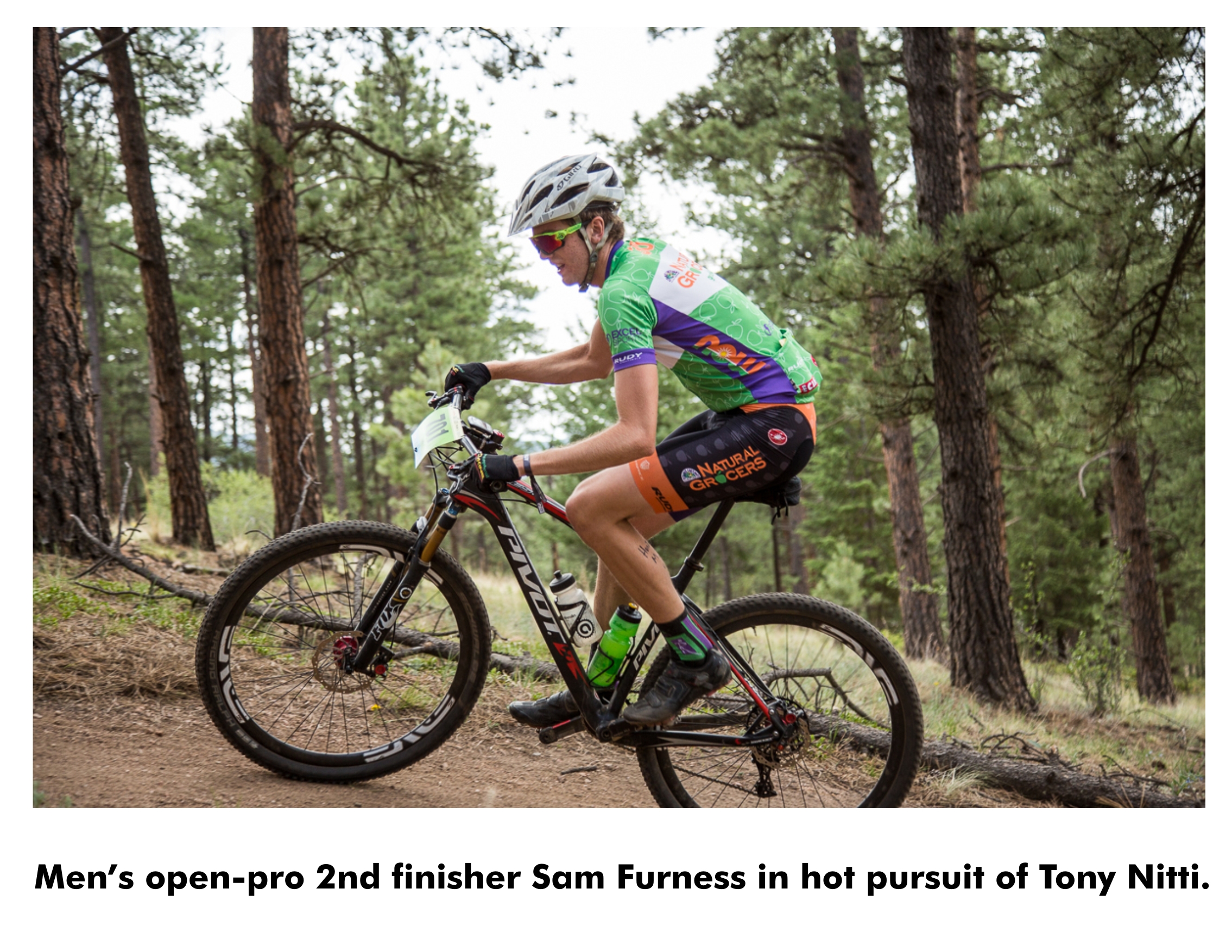 On the next short climb I was able to claw onto Marks wheel, but on the subsequent fast descent to the start of the Baldy climb, both he and Sam put some distance on me. The Baldy climb is a solid thirty minutes, followed by a twenty-five minute descent that’s the longest of the race. I knew if I didn’t make a move on Baldy, they would gap me by too much on the descent to overcome. So I put in a big dig, caught Sam and then Mark, and then climbed solo to the top. I must have put four to five minutes on the two of them because, on the long descent, neither of them caught me. I hoped that if I could reach the Nice Kitty climb and get out of sight before they could see me, they might just let me go, and it appears that’s what happened.