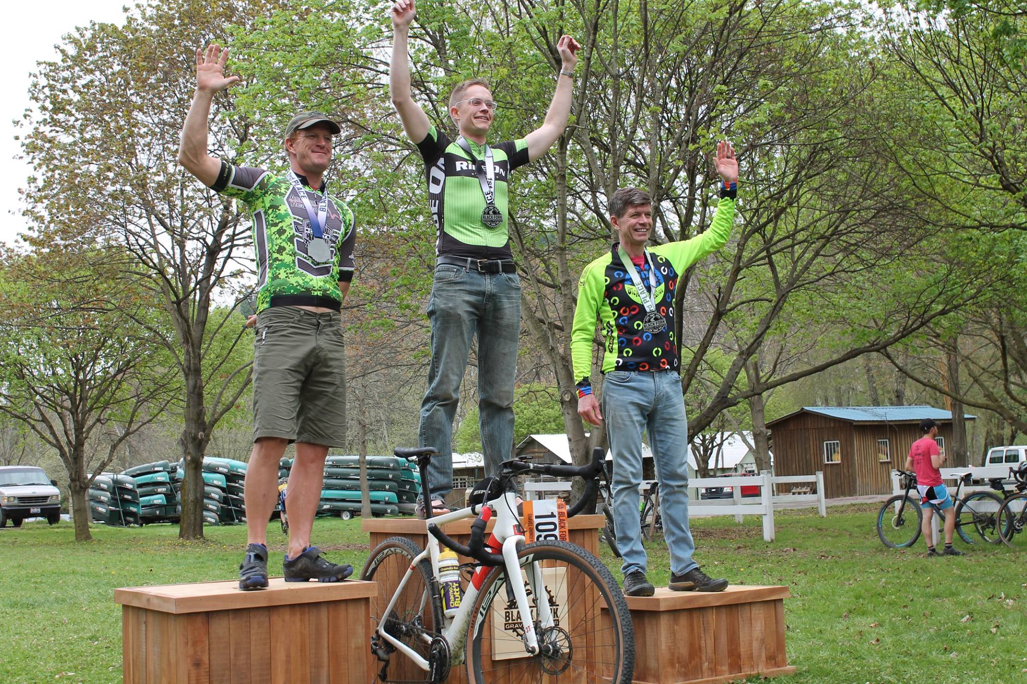 Men’s 54 mile overall podium: 1st- James Pooler 3:08:27 (Ride On), 2nd- Dan Payton: 3:13:32 (Champion city cycling), 3rd- John Wischmeier: 3:14:04 (Bicycle Station)