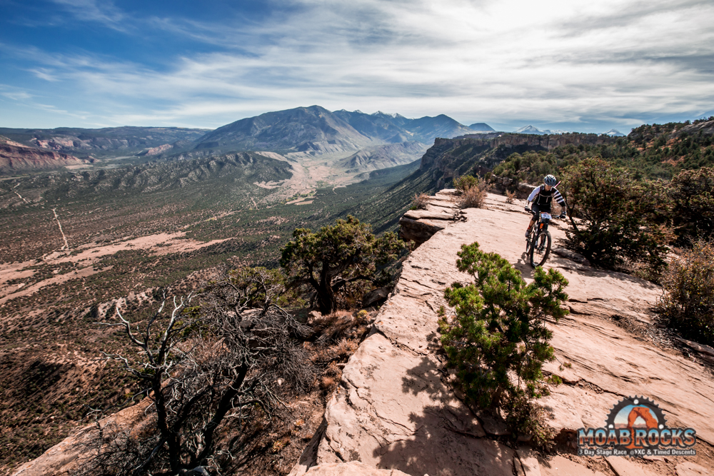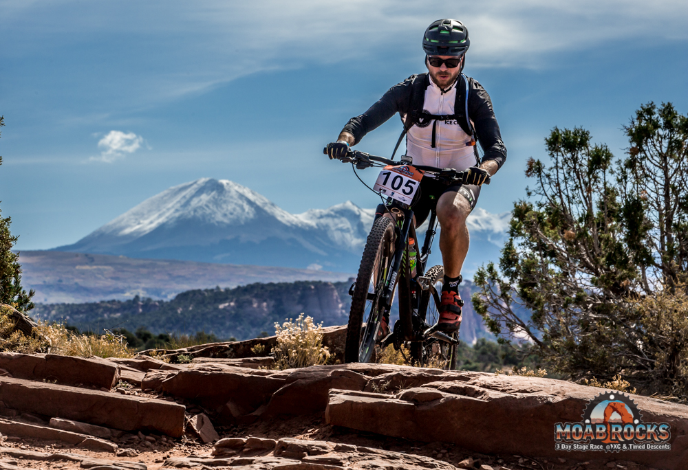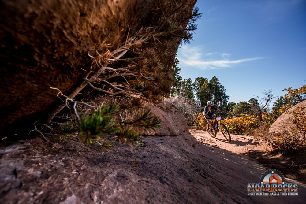 - Skills play a huge part in every mountain bike race. Here a rider is tested at the 2015 Moab Rocks stage race. Photo by: Raven Eye Photo