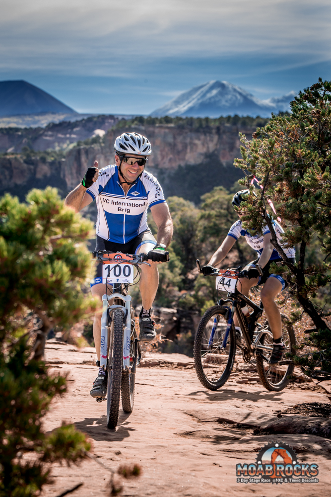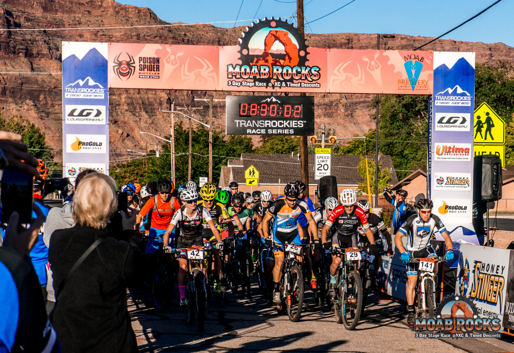 As riders lined up for the 8:30 AM start, conditions in Moab couldn’t have been better at the 3rd edition of the Moab Rocks mountain bike stage race. Clear skies and a warm sun peeking over the towering cliffs that surround Moab enticed over 100 racers daring enough to take on the 4,000-foot climb from downtown Moab to the top of the Upper Porcupine Singletrack trail.
