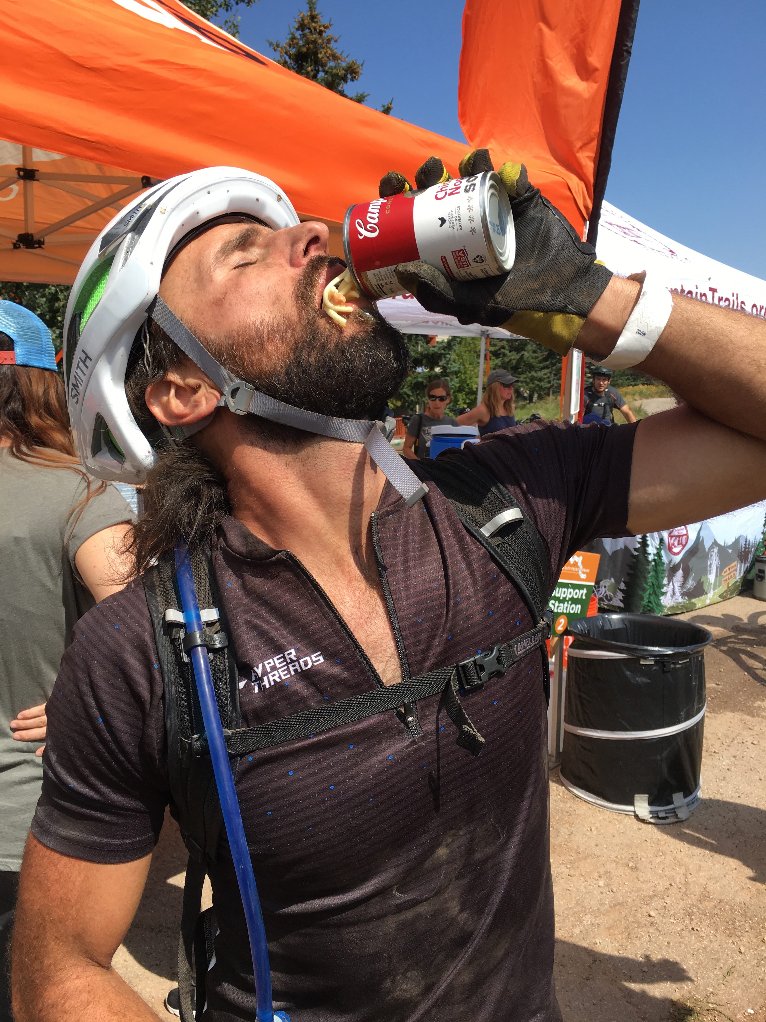 - P2P racer Casey Zaugg shotguns a can of soup trying to stay hydrated. Photo by: Shannon Boffeli