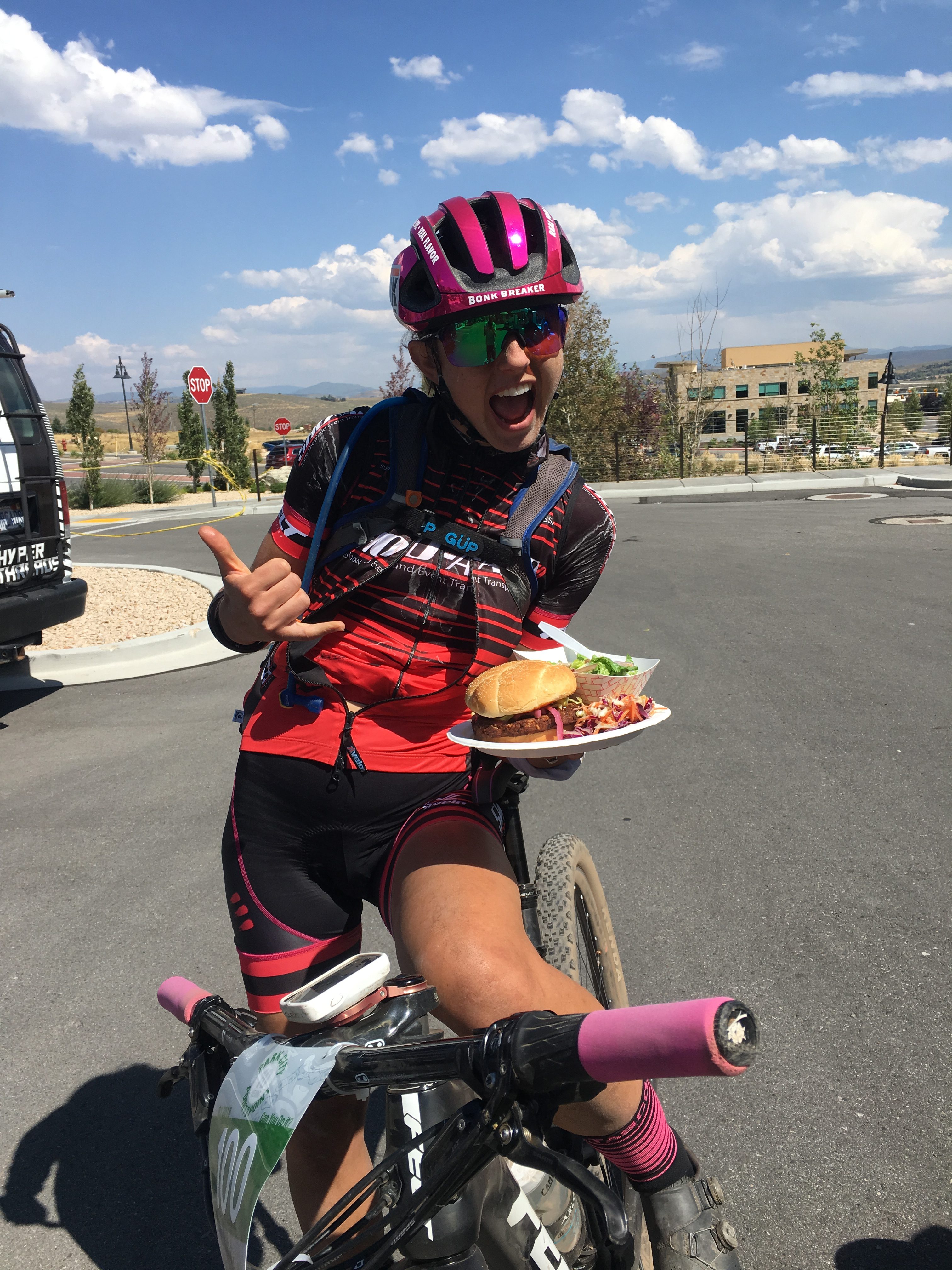 - Larissa Connors prepares to chow down on a well deserved post race meal. Photo by: Shannon Boffeli