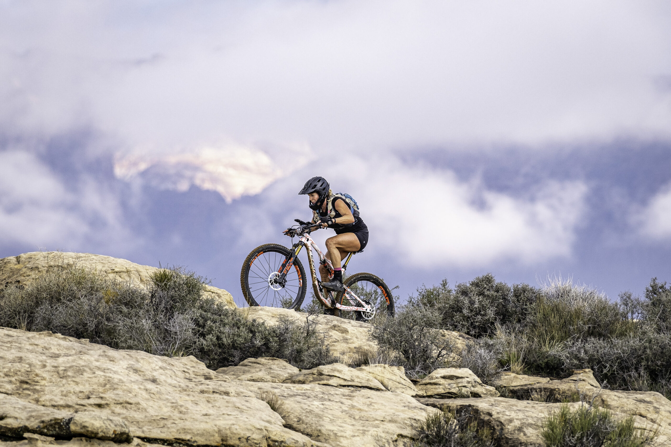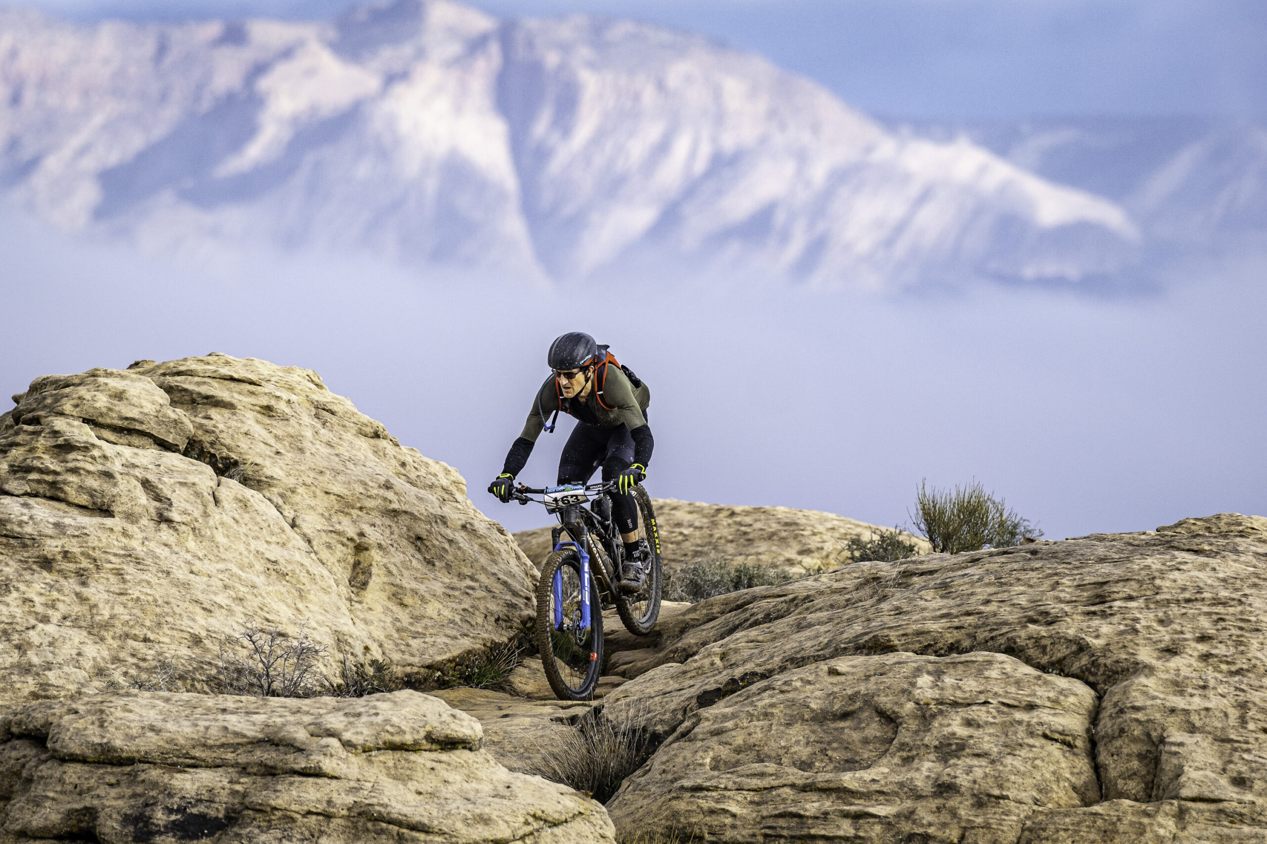 Even the reliably dry desert terrain of southern Utah has not been immune to the relentless weather systems that have pummeled the western US this winter. The night before the True Grit Epic rains fell for most of the night and riders awoke to some last minute changes to the course. The most critical of which being that the race start through Cove Wash was too muddy for riders to pass leading to a “neutral start” through town and onto the trails in Green Valley.