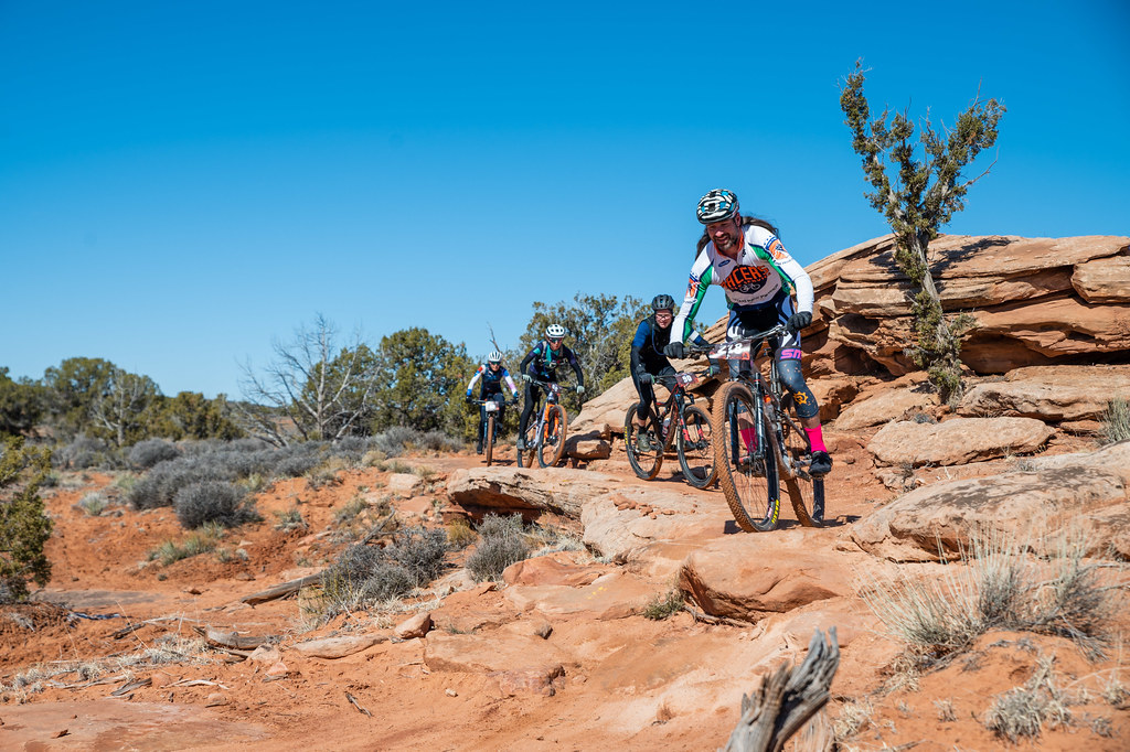 Stage 3, held at the Gemini Bridges trailhead, starts with some big climbs and a long section of jeep road before turning to singletrack. The lead groups powered up the climbs with Alexis Skarda (Santa Cruz HTsqd) leading the way but Juliana teammates Kaysee Armstrong and Evelyn Dong were just seconds behind.