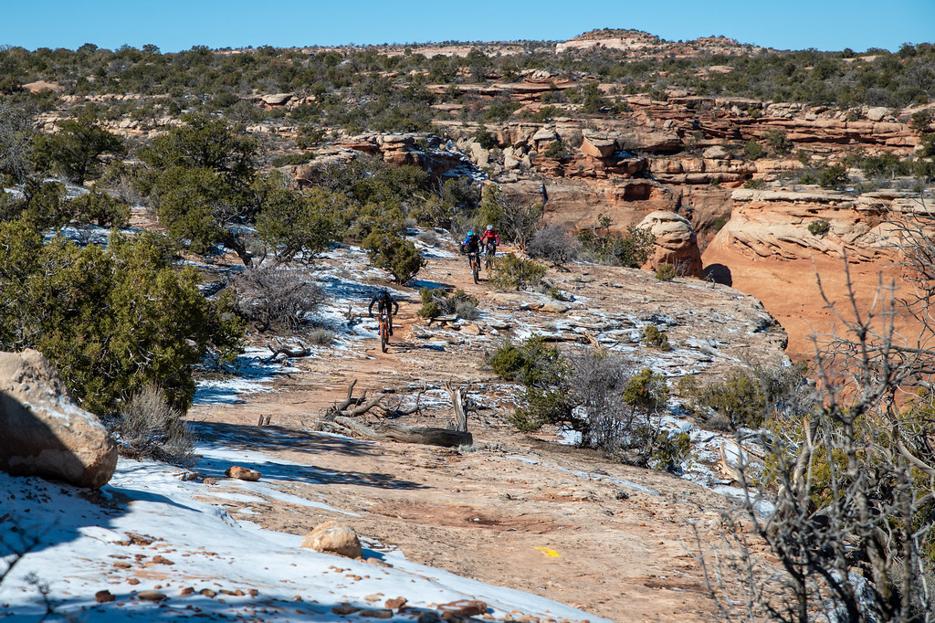 Racers shred the snow and slick rock combo at Moab Rocks 2023. Photo courtesy of Transrockies/Tony Campono