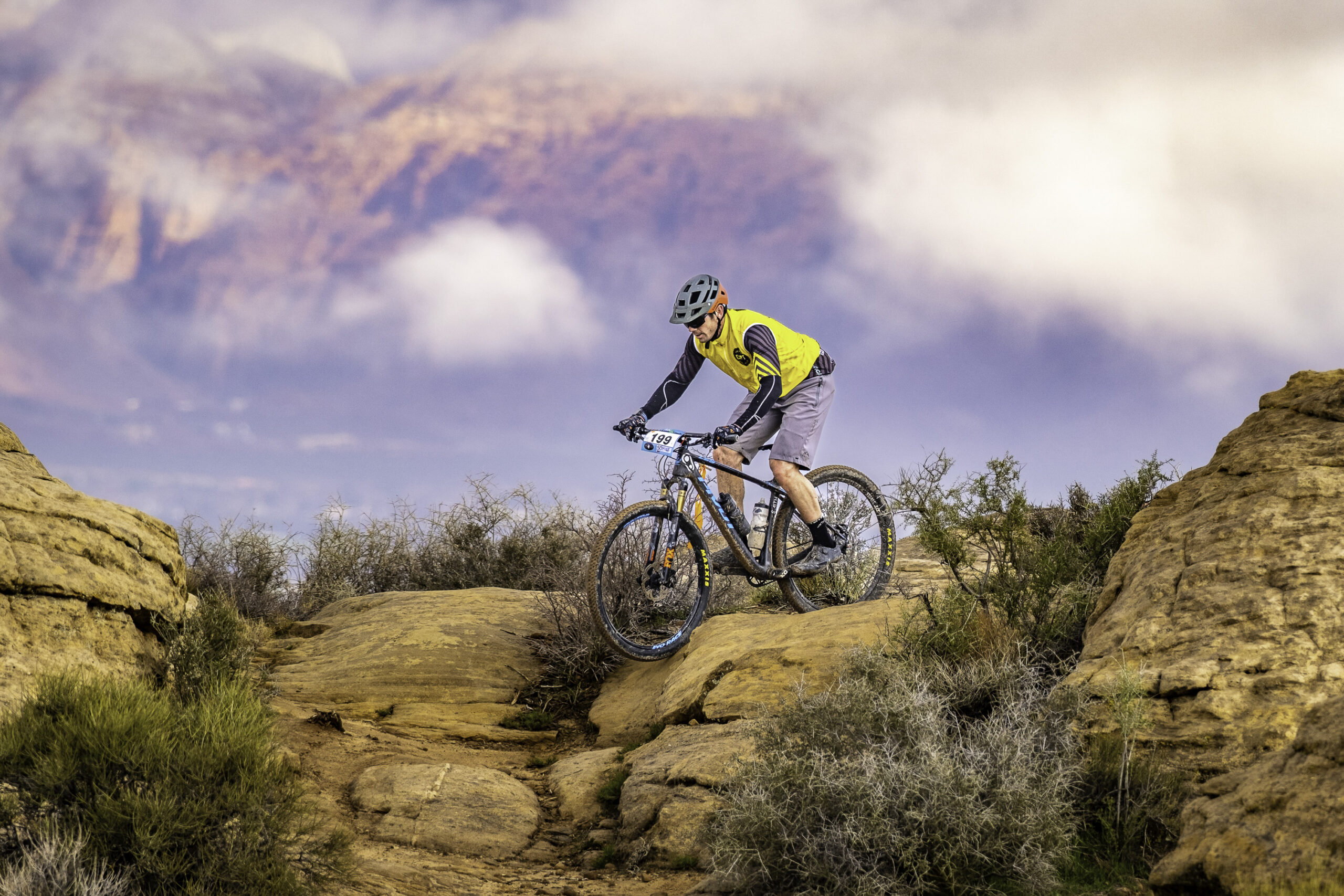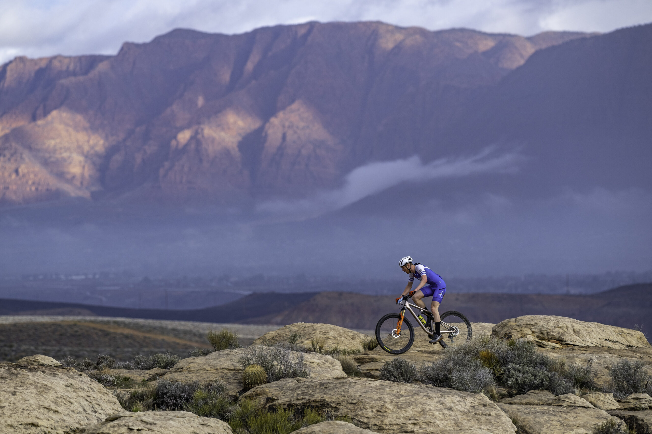 Even the reliably dry desert terrain of southern Utah has not been immune to the relentless weather systems that have pummeled the western US this winter. The night before the True Grit Epic rains fell for most of the night and riders awoke to some last minute changes to the course. The most critical of which being that the race start through Cove Wash was too muddy for riders to pass leading to a “neutral start” through town and onto the trails in Green Valley.